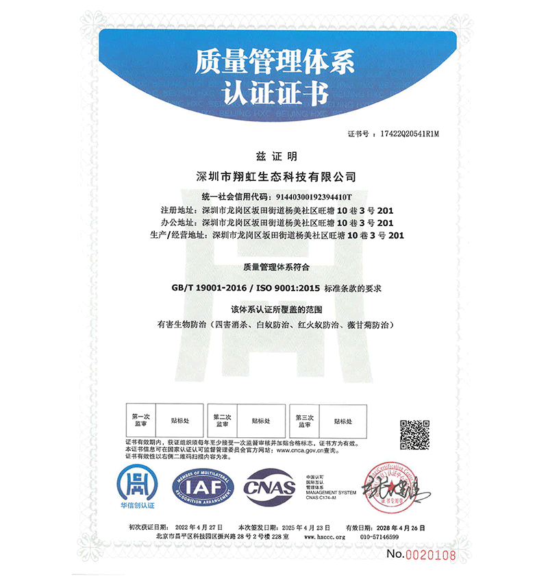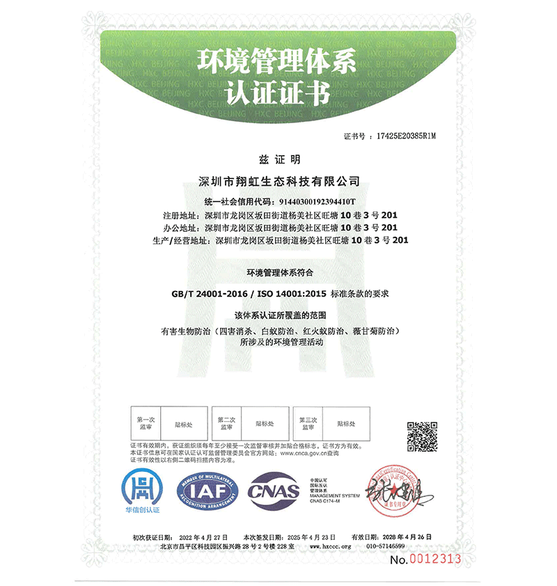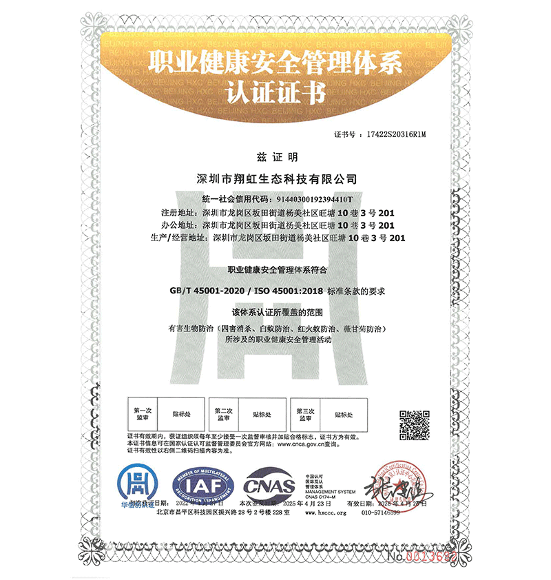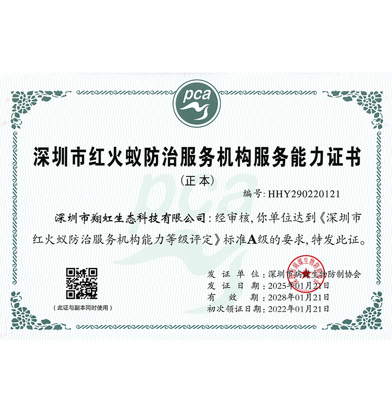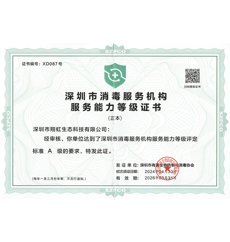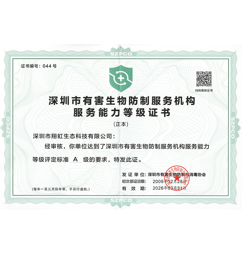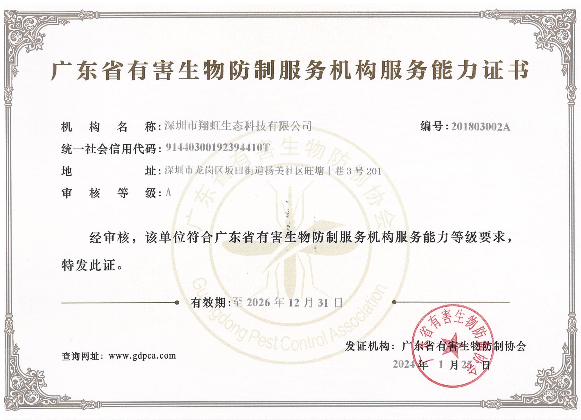 深圳市翔虹生态科技有限公司成立于1995年,是深圳最早成立的专业虫害防治公司之一。公司发展至今获得全国有害生物防制服务A级资质、广东省有害生物防制服务A级资质、深圳市有害生物防制服务A级资质、广东省有害生物防制服务A级资质、深圳市有害生物防制服务甲级资质的单位,是中国有害生物防治协会会员、广东省有害生物防治协会会员、深圳市有害生物防治协会理事单位,多次获得“深圳市十佳消杀单位”荣誉。