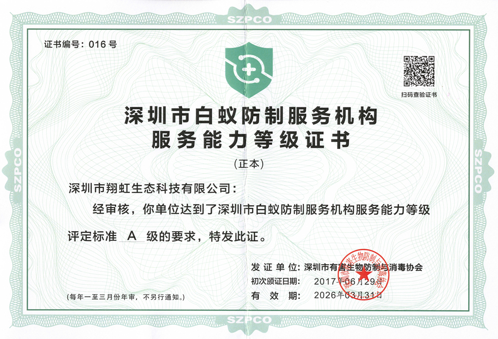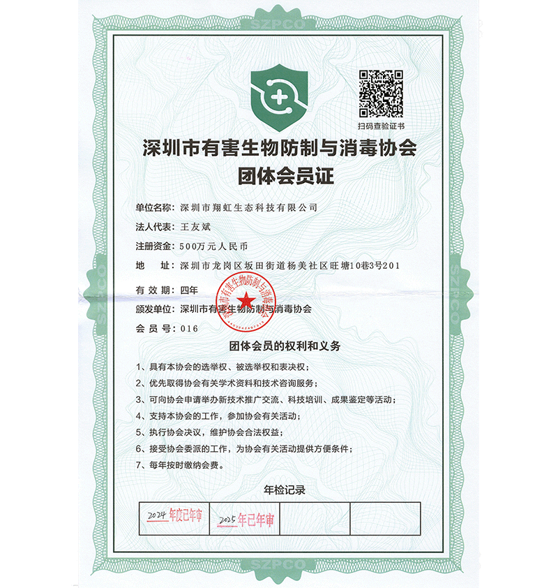 深圳市翔虹生态科技有限公司成立于1995年,是深圳最早成立的专业虫害防治公司之一。公司发展至今获得全国有害生物防制服务A级资质、广东省有害生物防制服务A级资质、深圳市有害生物防制服务A级资质、广东省有害生物防制服务A级资质、深圳市有害生物防制服务甲级资质的单位,是中国有害生物防治协会会员、广东省有害生物防治协会会员、深圳市有害生物防治协会理事单位,多次获得“深圳市十佳消杀单位”荣誉。